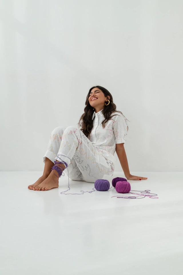 Lembra quando a gente não sabia desenhar, mas não tinha medo de tentar? A calça Rabisco, com seus bordados coloridos sobre o puro linho, celebra o improviso e a espontaneidade, capturando a assência da cápsula Reencontro.