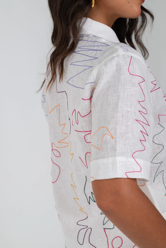 Camisa manga curta, com barra arredondada, botões brancos, e sinuosas linhas coloridas bordadas em sua frente, costas e mangas. Em puro linho, ela possui um caimento leve e fresco.
